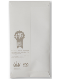 De accessoires hebben een verpakking die voor 100% gemaakt is uit steenpoeder en bedrukt is met plantaardige verf. De verpakking is daarom 100% biologisch afbreekbaar.